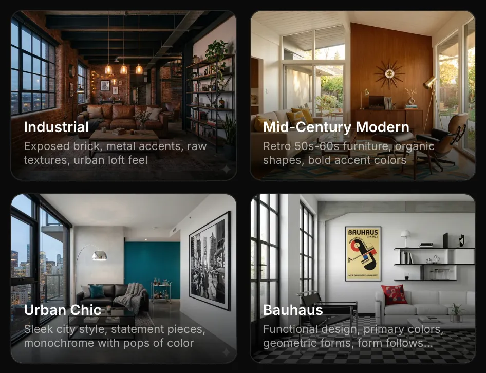 Pick a style — modern, scandinavian, luxury — and AI redesigns the room in seconds.